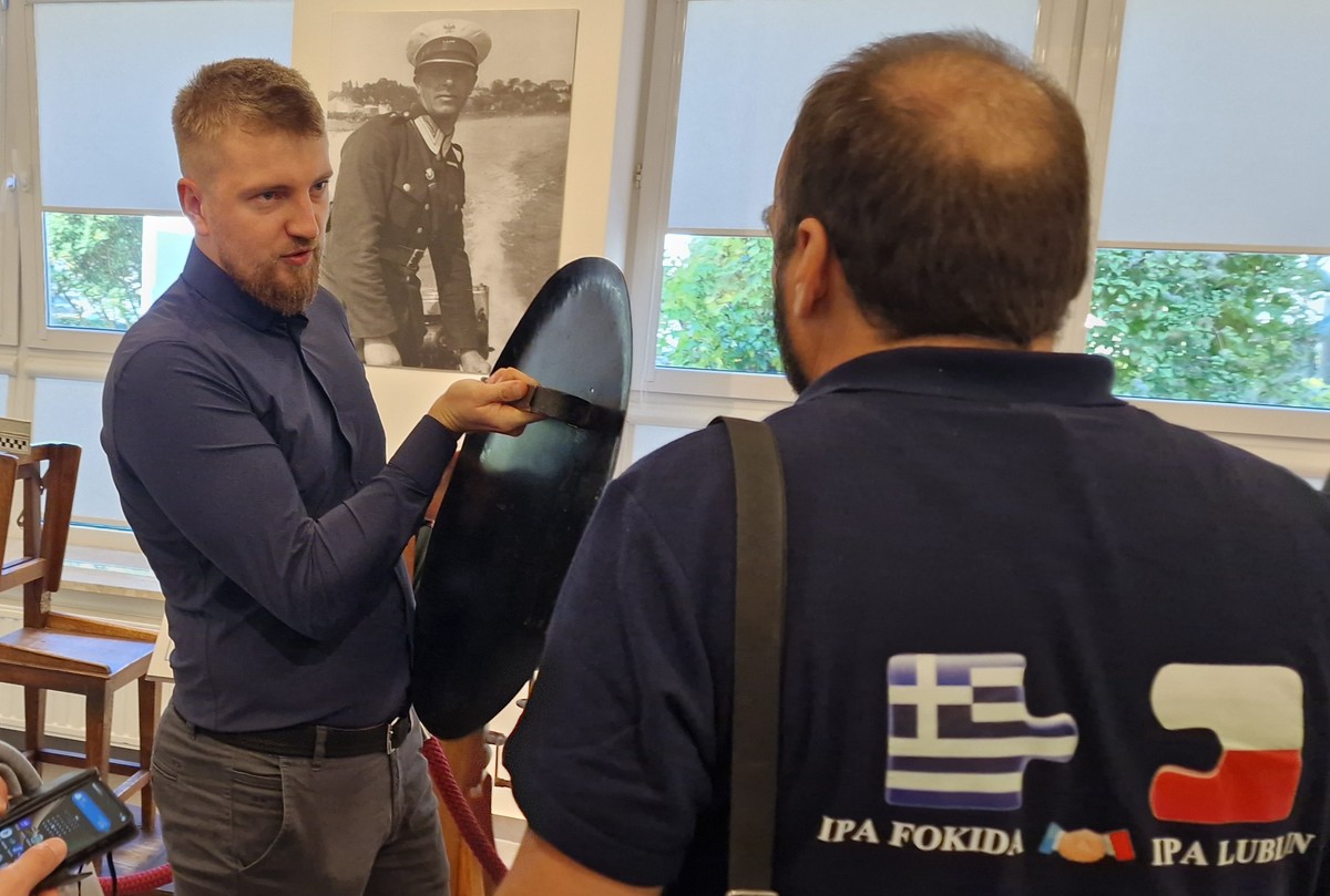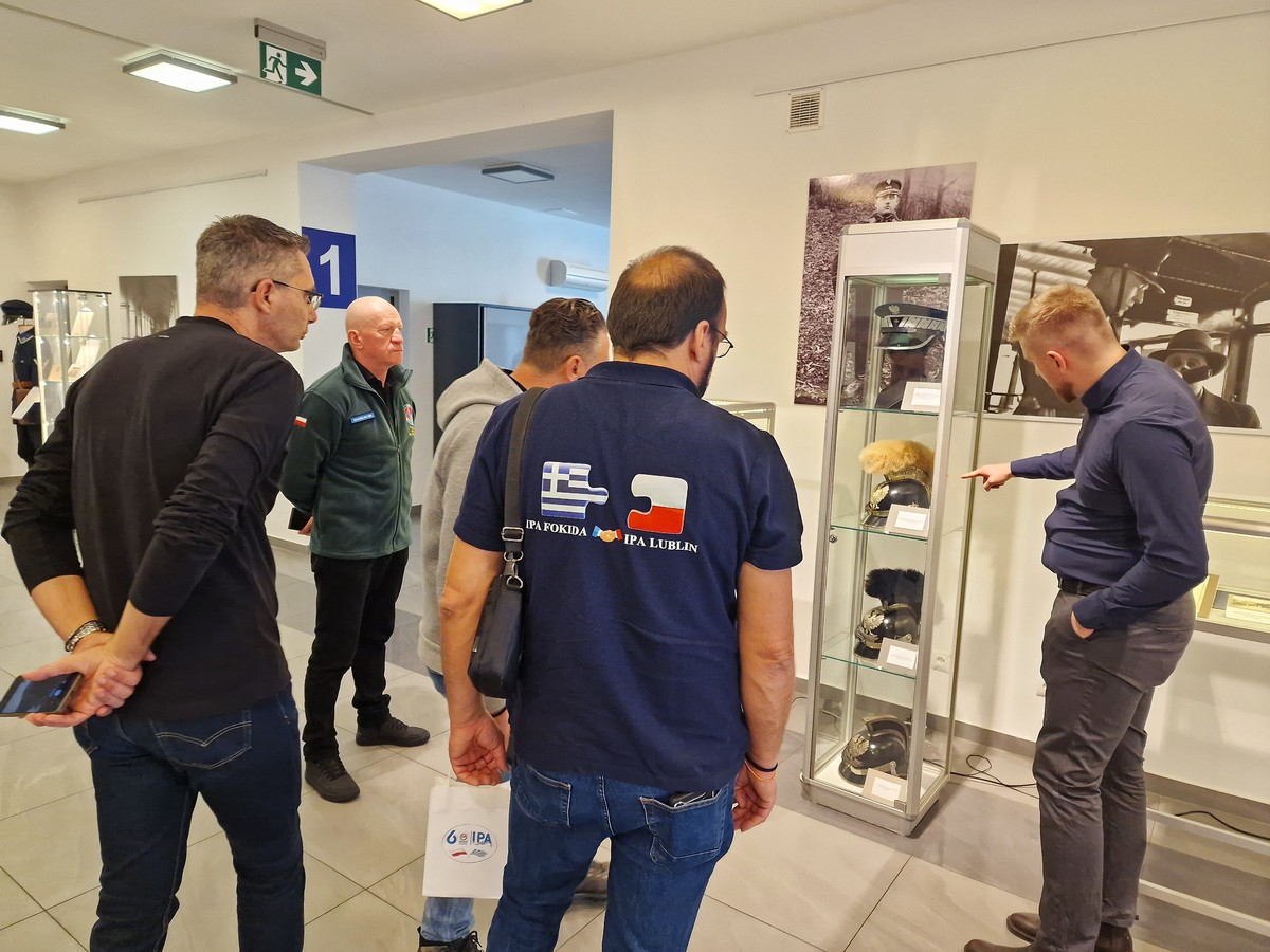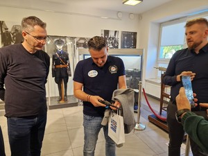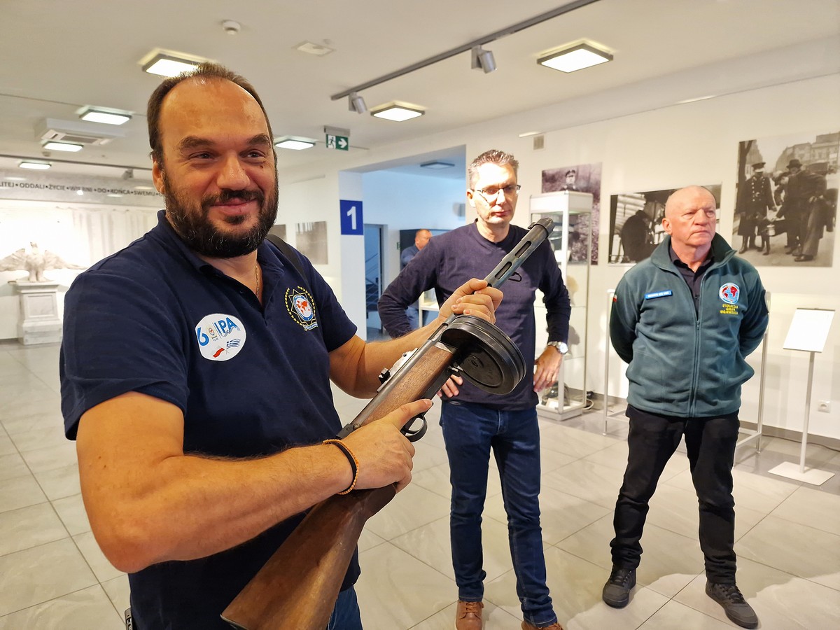 Gdy nagle wybiła „godzina zero” i chętni do zwiedzania pojawili się w łączniku prowadzącym do auli, w progu od frontu stanęła jeszcze jedna grupa, tym razem grecko-polska, która również postanowiła zaszczycić nas swoją obecnością. A że była to delegacja z samej Hellady, w dodatku z Międzynarodowego Stowarzyszenia Policji IPA, przyprowadzona do nas przez znanego z wielu inicjatyw w środowisku policyjnym mł. insp. w st. spocz. Andrzeja „Pułko” Kuczyńskiego trzeba było na biegu przeorganizować plan działania i podjąć nieoczekiwanych gości. Dobrze, że ekspozycje mamy rozłożone na trzech poziomach, a współczesne telefony można wykorzystać także do robienia zdjęć.