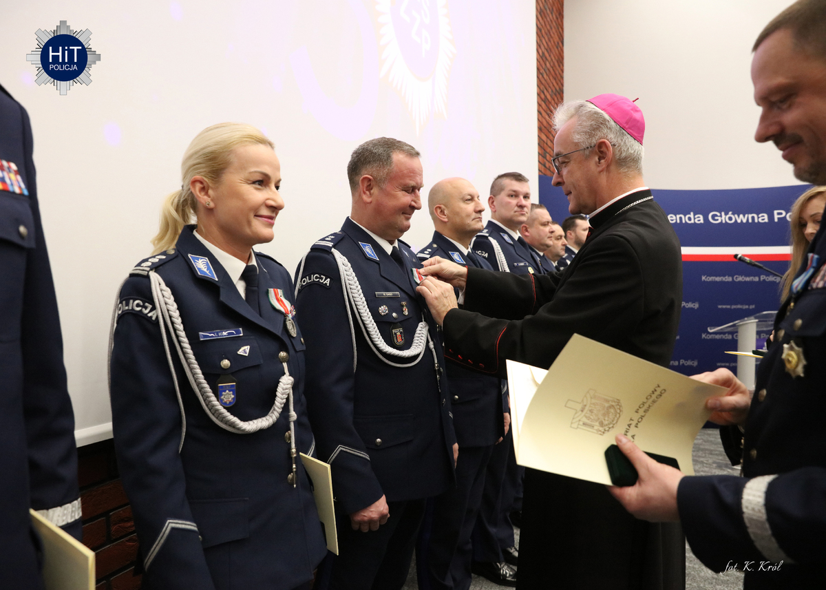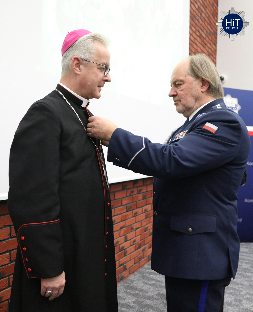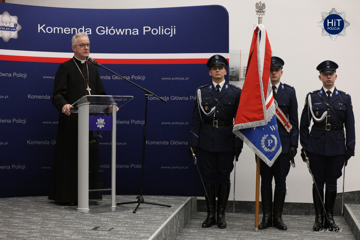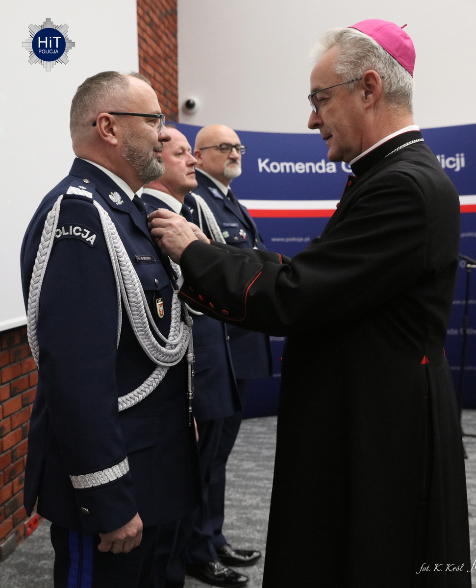 - I właściwie mógłbym tu skończyć swoje wystąpienie, bo w tych kilku wersach jest wszystko to, z czym mieliśmy tu dzisiaj do czynienia – powiedział gen. insp. Marek Boroń. – Ekscelencjo, Księże Biskupie, bardzo dziękuję w imieniu swoim i wszystkich, którzy zostali odznaczeni za to ogromne wyróżnienie. Ten niebieski mundur, w myśl naszego motta „Pomagamy i Chronimy”, często widoczny jest właśnie w tym momencie, kiedy człowiek upada i potrzebuje pomocy. Jesteśmy dzisiaj wszędzie, mierzymy się z takimi zadaniami, jakich kiedyś nie było, sami wiecie w jakich warunkach służymy i z czym musi zmagać się cała nasza Ojczyzna. Życzę Wam wytrwałości i żebyśmy budowali taką Ojczyznę, która będzie odpowiadać na wyzwania dnia dzisiejszego i w której człowiek będzie najważniejszy.