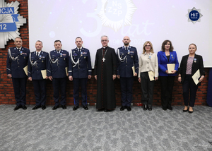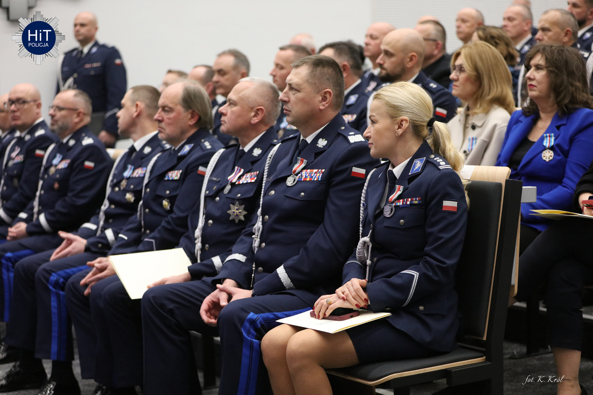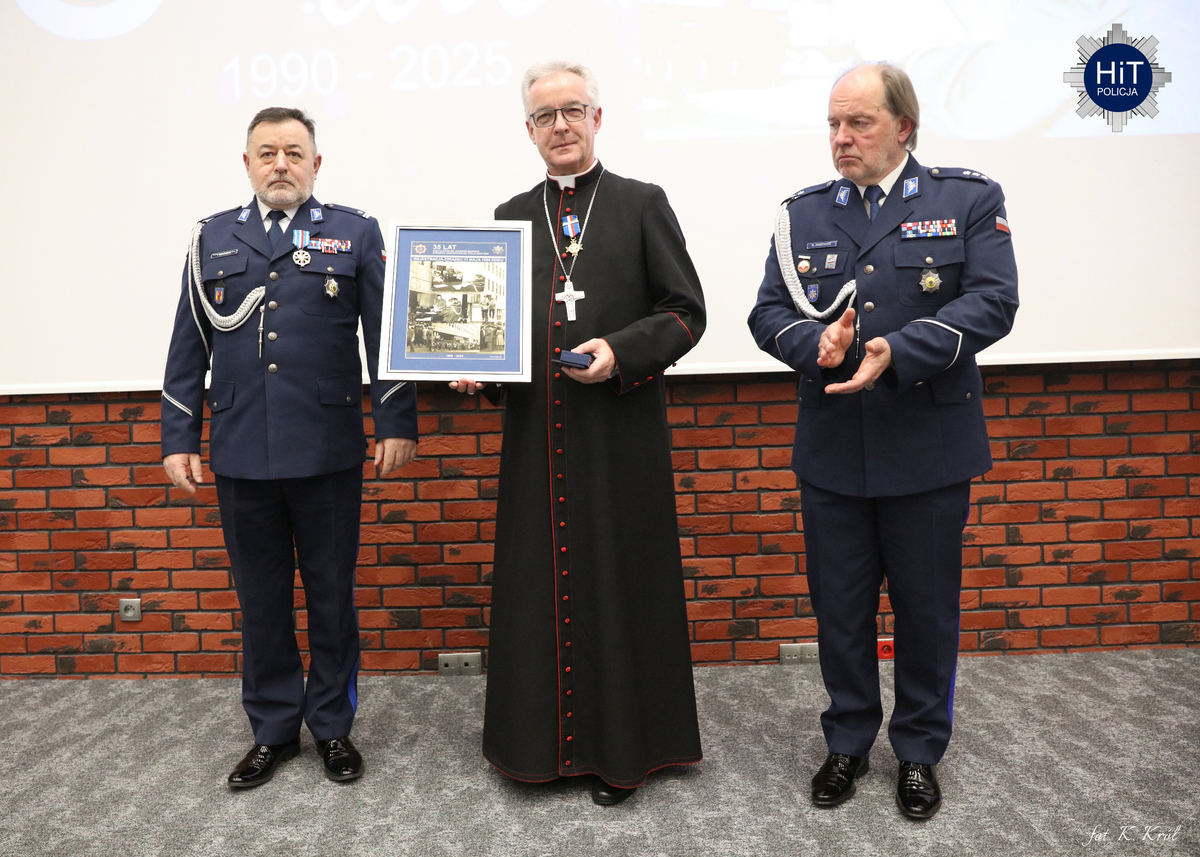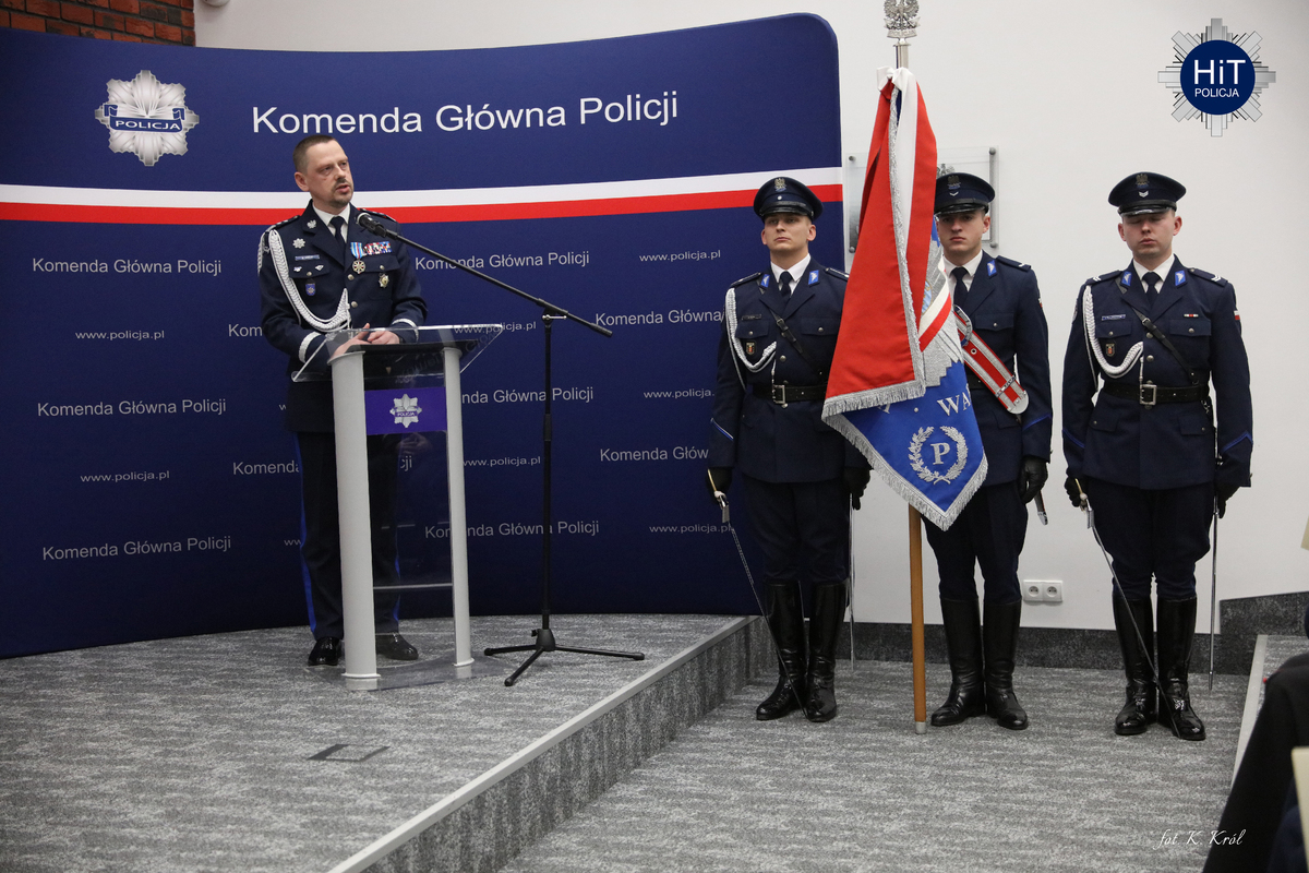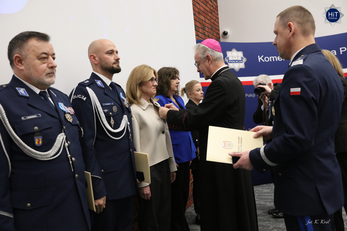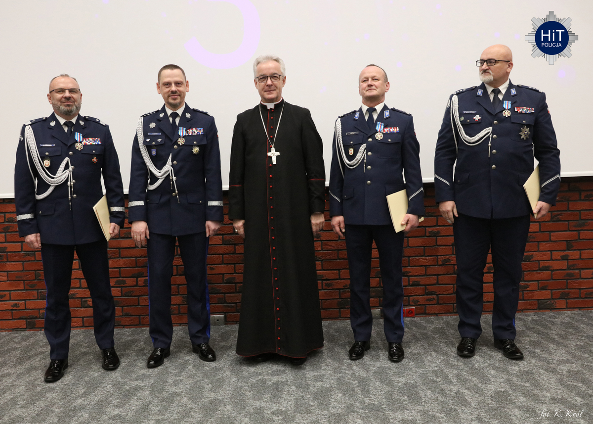 - I właściwie mógłbym tu skończyć swoje wystąpienie, bo w tych kilku wersach jest wszystko to, z czym mieliśmy tu dzisiaj do czynienia – powiedział gen. insp. Marek Boroń. – Ekscelencjo, Księże Biskupie, bardzo dziękuję w imieniu swoim i wszystkich, którzy zostali odznaczeni za to ogromne wyróżnienie. Ten niebieski mundur, w myśl naszego motta „Pomagamy i Chronimy”, często widoczny jest właśnie w tym momencie, kiedy człowiek upada i potrzebuje pomocy. Jesteśmy dzisiaj wszędzie, mierzymy się z takimi zadaniami, jakich kiedyś nie było, sami wiecie w jakich warunkach służymy i z czym musi zmagać się cała nasza Ojczyzna. Życzę Wam wytrwałości i żebyśmy budowali taką Ojczyznę, która będzie odpowiadać na wyzwania dnia dzisiejszego i w której człowiek będzie najważniejszy.