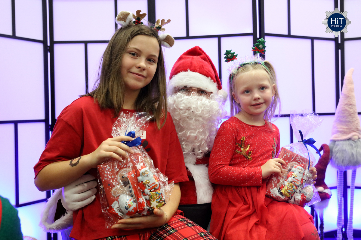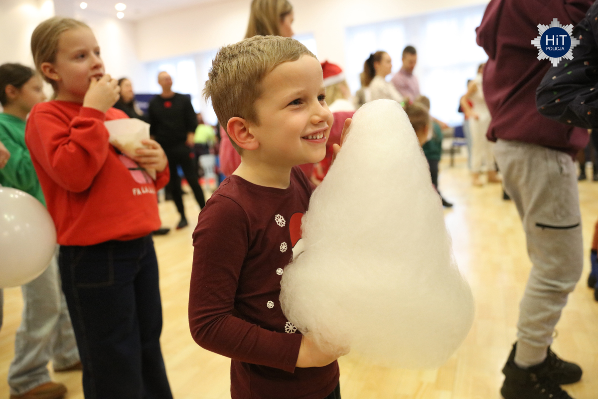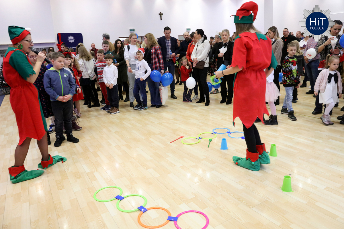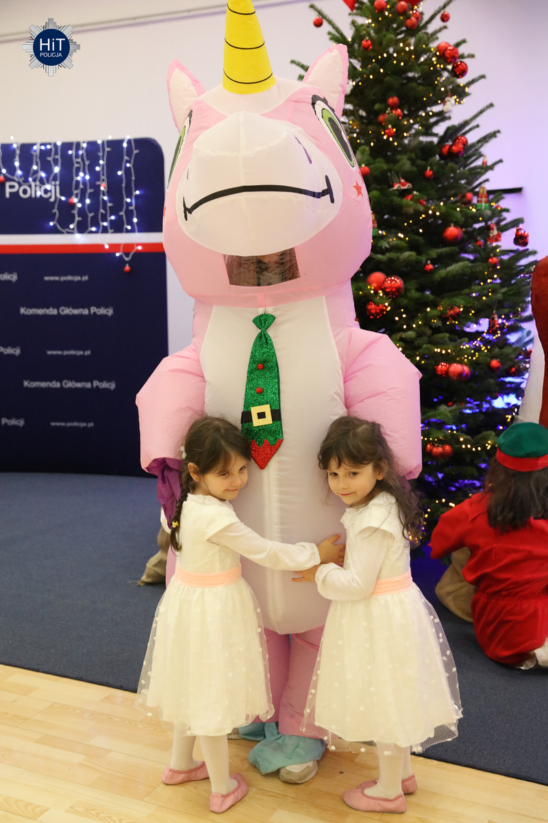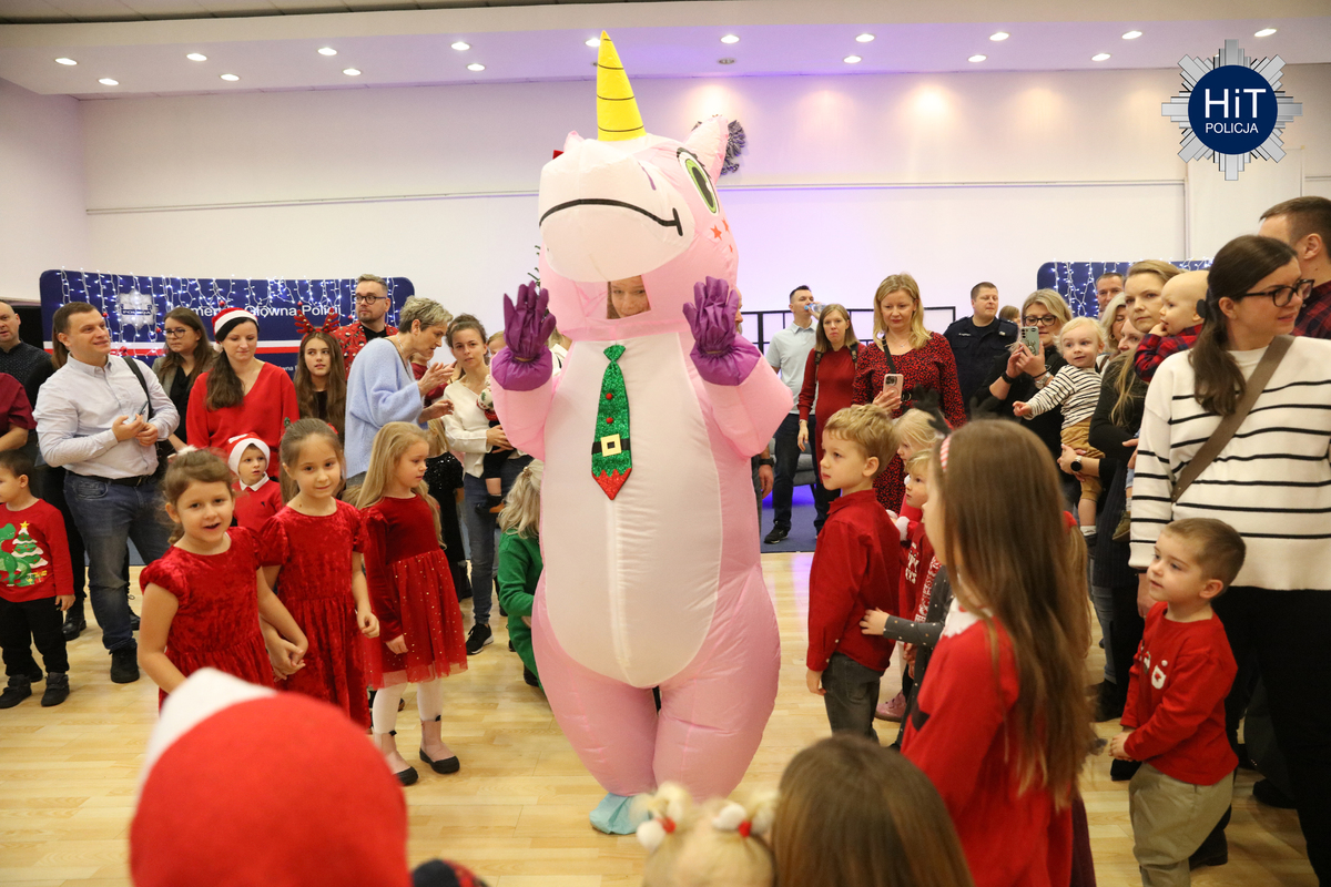 Milusińskich było ponad… pół tysiąca, więc mikołajkowe zabawy podzielone zostały na trzy grupy, w których przygotowano atrakcje adekwatne do wieku. Były więc wodne tatuaże, kolorowanki, zdobienie pierników, a dla starszych także tworzenie kartek świątecznych. Najbardziej wyczekiwanym gościem był Mikołaj, który miał do pomocy elfy: Fikusia, Migotka i Śmieszka. Zjawił się nawet jednorożec, który trochę napsocił, a dzieci pomagały w uspokojeniu go i opanowaniu chaosu w fabryce prezentów. Przeprowadzono konkurs na odgadywanie tytułów piosenek oraz kolęd, na parkiecie królowały tańce, a prowadzący proponowali mnóstwo zabaw integracyjnych. W mikołajkową sobotę w KGP można było spotkać maskotki policyjne, przewodników z psami służbowymi, specjalsów z Centralnego Pododdziału Kontrterrorystycznego Policji „BOA” oraz funkcjonariuszy z Centralnego Laboratorium Kryminalistycznego Policji z walizką daktyloskopijną. Niespodzianką, także dla rodziców była wizyta Komendanta Głównego Policji gen. insp. Marka Boronia, który wziął udział w świątecznym spotkaniu. Czas umilali muzycy z Orkiestry Reprezentacyjnej Policji. Na spragnionych i złaknionych czekały napoje i małe co nieco, przygotowane przez związkowców z NSZZ „Solidarność”.
