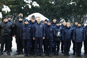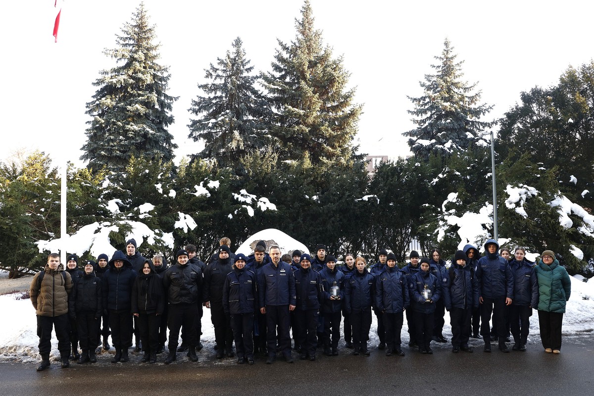 Ale po kolei – już przed godziną 9.00 grupa uczniów z Wiśniowej Góry, położonej na terenie powiatu łódzkiego wschodniego, otrzepywała ze śniegu buty na naszym dziedzińcu i rozdziewała się z ciepłych okryć. Razem z młodzieżą przybyli: Dyrektor Liceum Ogólnokształcącego im. Jana Karskiego w Wiśniowej Górze Ilona Janowska, nauczycielka Małgorzata Lis, koordynator klas mundurowych w liceum kom. Urszula Ptasznik Komendant Komisariatu Policji w Rzgowie, będącego częścią KPP Powiatu Łódzkiego Wschodniego oraz asp. szt. Aneta Żyłka-Banaszczyk Kierownik Posterunku Policji w Andrespolu, na którego terenie położona jest szkoła w Wiśniowej Górze. Jeszcze przed przybyciem autokaru z młodzieżą dotarł do nas Prezes Stowarzyszenia „Rodzina Policyjna 1939 r.” w Łodzi Jarosław Olbrychowski. Zjawiła się również Prezes Świętokrzyskiego Stowarzyszenia „Rodzina Policyjna 1939 r.” w Kielcach Grażyna Szkonter.