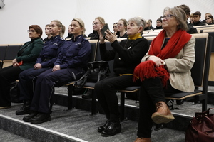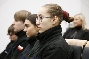W Sali im. Państwowego Korpusu Bezpieczeństwa gości powitał Naczelnik Wydziału Edukacji Historycznej Gabinetu Komendanta Głównego Policji podinsp. Marcin Lasota. Młodzież zapoznała się z działalnością Wydziału i obejrzała jeden z filmów, zrealizowanych w roku jubileuszu służby kobiet w Policji, które można zobaczyć na naszym kanale w serwisie YouTube (https://www.youtube.com/@muzeumpolicji/videos).