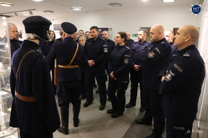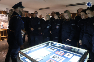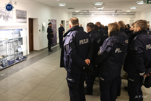 Z Legionowa do Warszawy jest przysłowiowy rzut beretem, ale nawał zajęć sprawił, że kursanci z CSP dotarli do naszej siedziby już późnym popołudniem. Nic dziwnego – hybrydowe szkolenie, które zaczęło się 8 grudnia 2025 r. najpierw realizowane było w formule online i w dużej mierze polegało na samokształceniu, teraz natomiast przyszedł czas na ćwiczenia, zaliczenia i egzaminy, które odbywają się stacjonarnie. Następnego dnia po zakończonej wieczorem wizycie w stolicy przyszłych oficerów czekał kolejny egzamin. A mimo to z zaciekawieniem obejrzeli wystawy, przygotowane w siedzibie naszego Wydziału i wysłuchali opowieści o dziejach służb policyjnych w Polsce.
