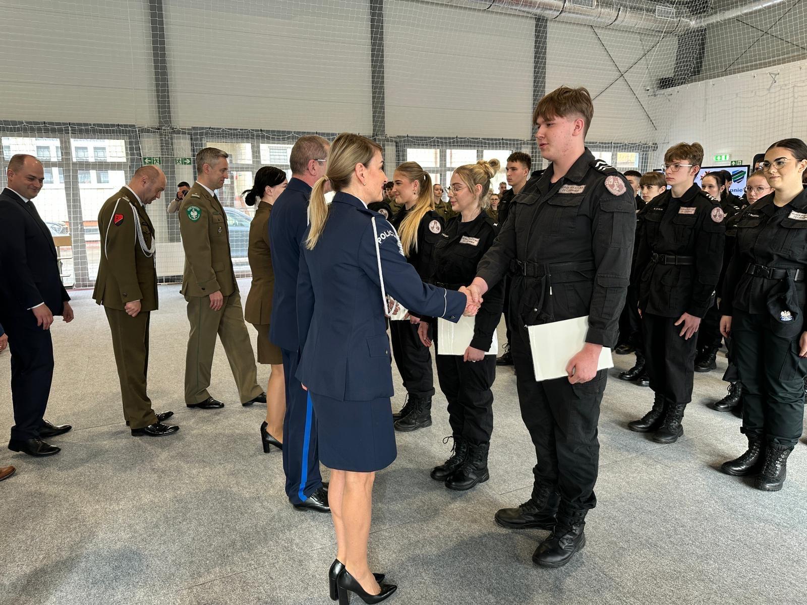 Policjantka z Gabinetu Komendanta Głównego Policji pogratulowała wyróżnionym kadetom, złożyła życzenia realizacji planów i wszelkiej pomyślności. Podkreśliła przy tym, że droga kształcenia w klasach mundurowych, którą wybrali wiąże się z kultywowaniem wartości patriotycznych i licznymi odwołaniami do historii oraz dbałością o bezpieczeństwo innych ludzi i postawami proobronnymi.