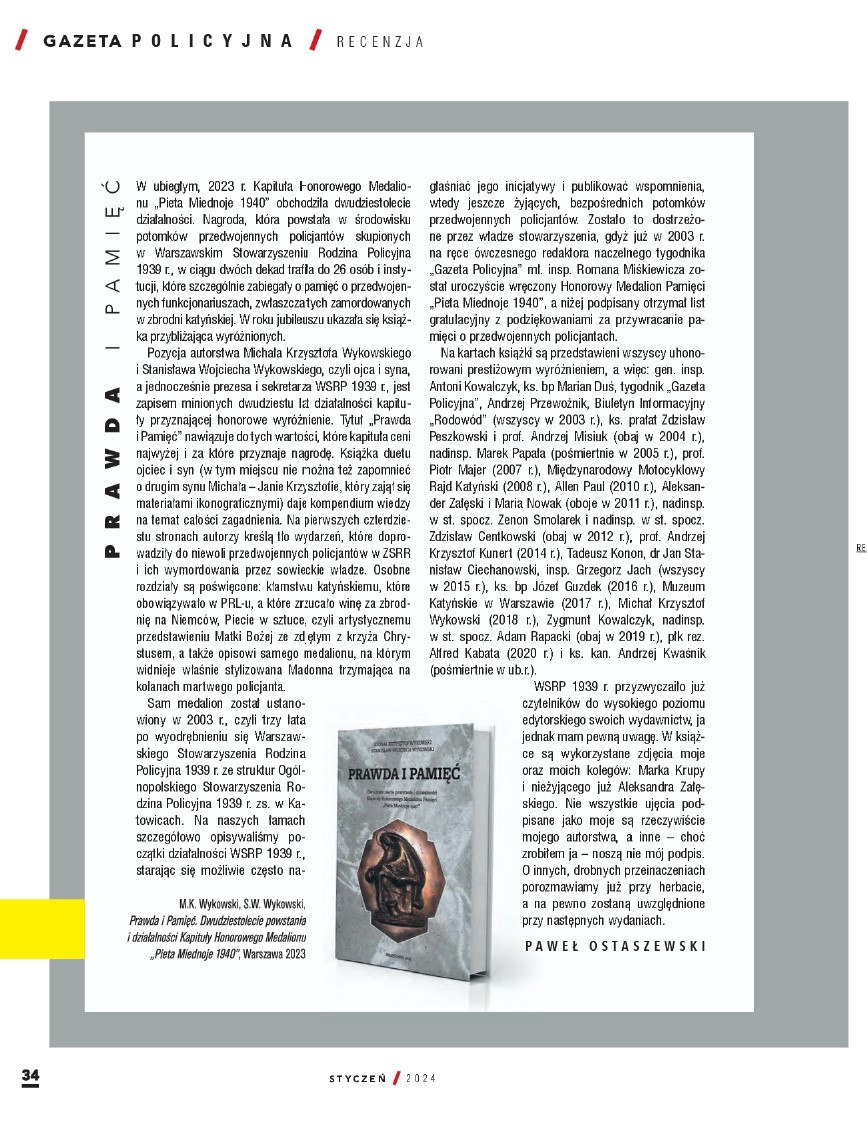 P. Ostaszewski,"Prawda i pamięć", Miesięcznik "Gazeta Policvjna", styczeń 2024 r.,