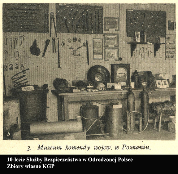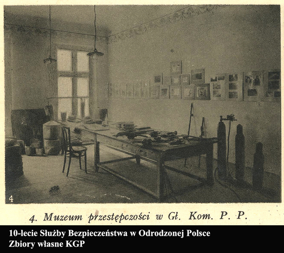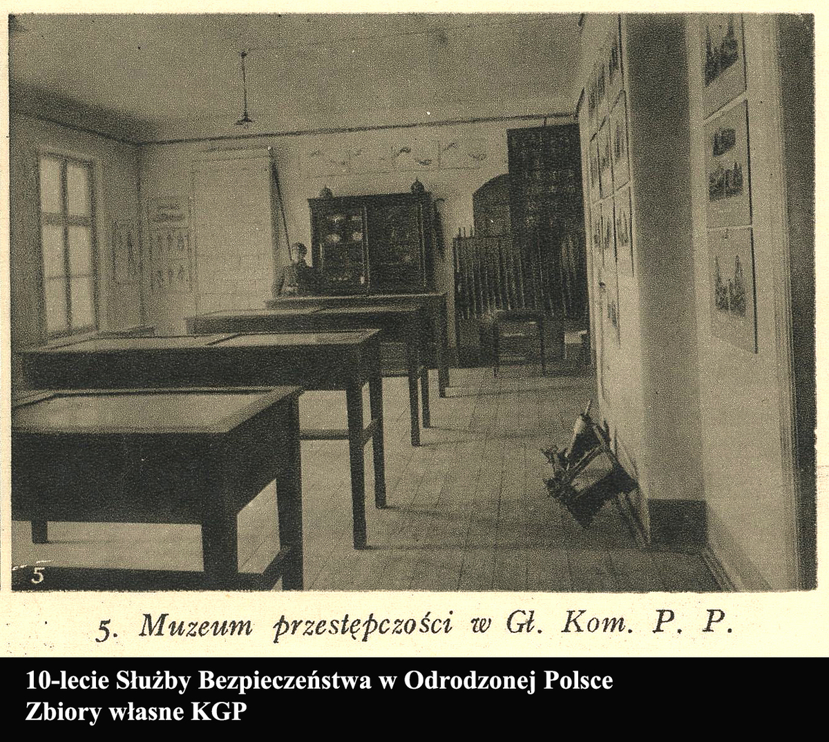 W Komendzie Głównej Policji Państwowej przy ulicy Nowy Świat 67 w Warszawie w jednym z pomieszczeń na drugim piętrze znajdowało się Muzeum Kryminalne. Na zbiory Muzeum składały się artefakty o różnym charakterze, wykorzystywane przez kryminalistów przy okazji przestępstw, takich jak: włamania, kradzieże, „prucie” – to jest otwieranie kas pancernych, napady rabunkowe, zabójstwa, fałszerstwa, nielegalna produkcja alkoholu, ucieczki, pornografia czy działalność terrorystyczna różnych organizacji politycznych np. komunistycznych. Takie przedmioty, wykorzystywane jako dowody w śledztwach i procesach przeciwko zbrodniarzom, z czasem były przekazywane do Muzeum Kryminalnego, jako pouczające ciekawostki.