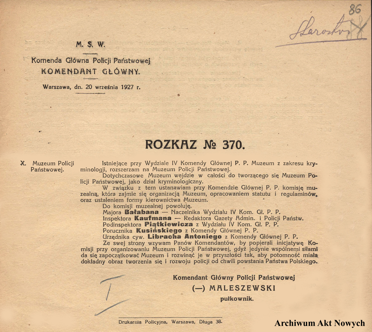 „Istniejące przy Wydziale IV Komendy Głównej P.P. Muzeum z zakresu kryminologii, rozszerzam na Muzeum Policji Państwowej. Dotychczasowe Muzeum wejdzie w całości do tworzącego się Muzeum Policji Państwowej, jako dział kryminologiczny.”