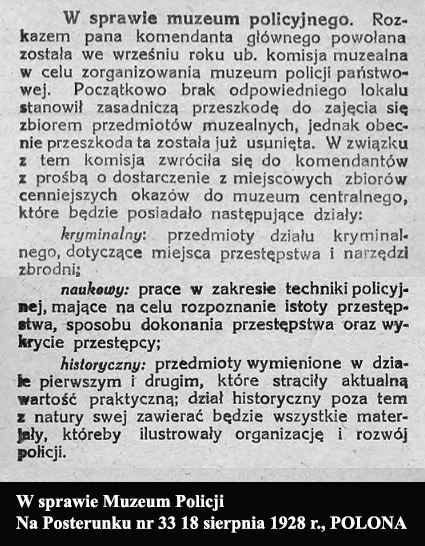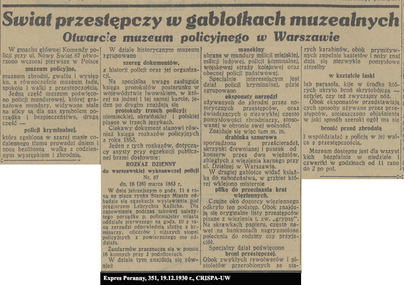 „W gmachu głównej Komendy policji przy ul. Nowy Świat 67 otworzono wczoraj pierwsze w Polsce muzeum policyjne, muzeum zbrodni, gwałtu i występku, a równocześnie muzeum ładu, spokoju i walki z przestępczością”. Taką relację można znaleźć w Expressie Porannym w numerze 351. z dnia 19 grudnia 1930 r.
