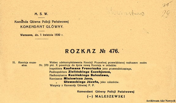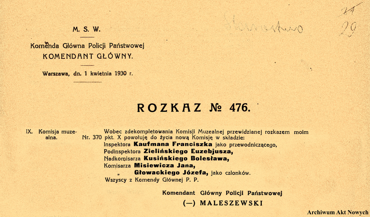 W 1930 r. Komendant Główny Policji Państwowej pułkownik (inspektor) Janusz Jagrym Maleszewski w rozkazie nr 476, pkt. IX, z dnia 1 kwietnia tego roku powołał kolejną komisję muzealną w nowym składzie: