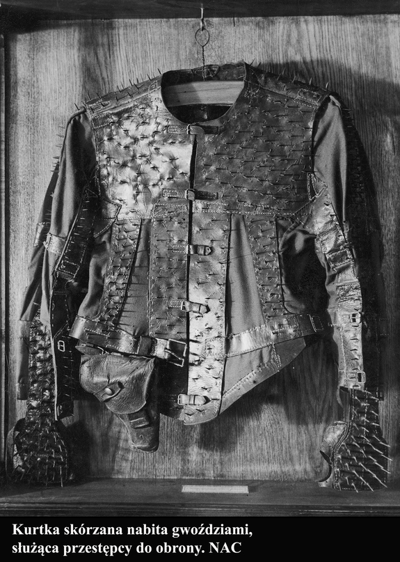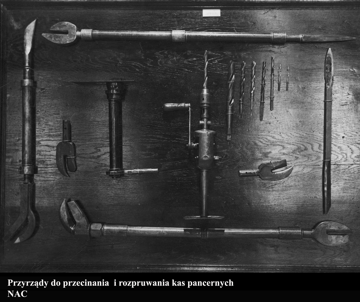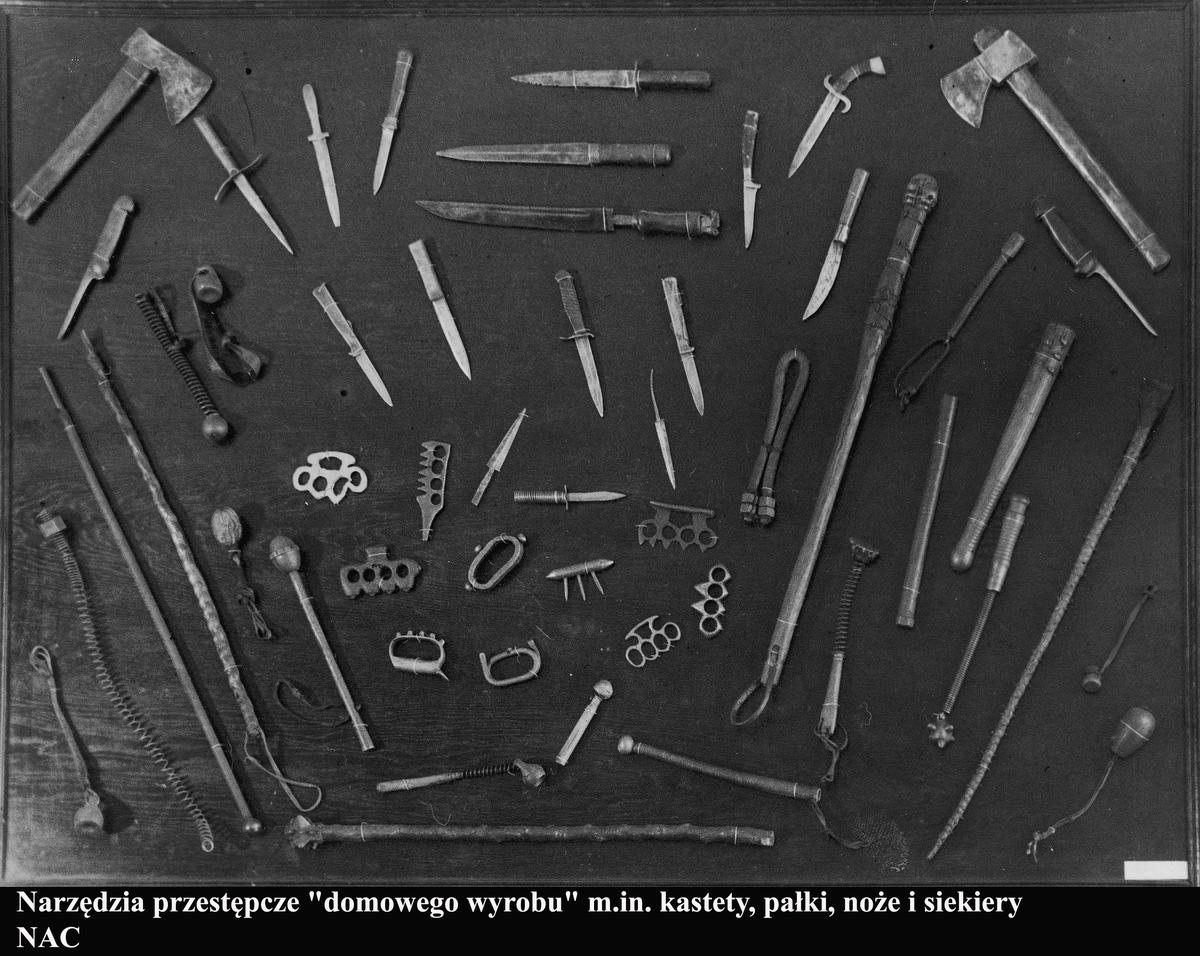 „[…] raki, świdry do prucia kas. Aparaty tlenowe do topienia pancerzy, namiot kasiarski, nożyce do cięcia krat i kłódek, kaftan nabijany gwoździami, użyty przez przestępcę w województwie krakowskim, wszelkiego rodzaju narzędzia włamywaczy, obcięte karabiny, używane przez bandytów, broń skrytobójcza, laski jako broń palna lub z ukrytemi sztyletami, zamaskowane kastety i t. p., narzędzia używane do fałszowania banknotów, monet, znaczków, pieczęci i t. p., urządzenia potajemnej gorzelni, sposoby i narzędzia używane przez handlarzy narkotyków, literatura antypaństwowa i pornograficzna.