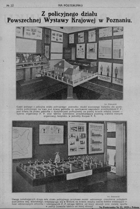 „[…] oryginalne odznaki policji państwowej i b. organizacyj służby bezpieczeństwa, jak: milicji miejskiej, policji komunalnej, straży kolejowej itp. Poza tem model wzorowego boksu – stoiska dla konia policyjnego, model sali wykładowej w szkole dla szeregowych P. P. w Mostach Wielkich, model wzorowego budynku na posterunek P. P. i inne. Ogólną uwagę zwracają: szafa z manekinami, ubranemi w oryginalne mundury milicji miejskiej, milicji ludowej, policji komunalnej, straży kolejowej, policji państwowej do r. 1927 i późniejsze oraz szafa z wydawnictwami policyjnemi. Uzupełnienie tego działu stanowią specjalne wykresy statystyczne i fotografje z dziedziny organizacji policji.”
