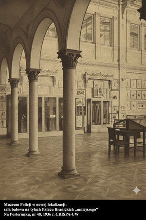 „Układ dzisiejszy zbiorów przedstawia się następująco: lewą stronę sali przeznaczono na dział historyczny, prawą kryminalny, zamknięty balkon na pornografię i komunę. Ściany nawprost wejścia przeznaczona jest na portrety zwierzchników policji, komendantów głównych oraz ludzi, którzy pracą swą w policji zasłużyli się dla niej.” („Na posterunku”, nr 48, 1936 r.)