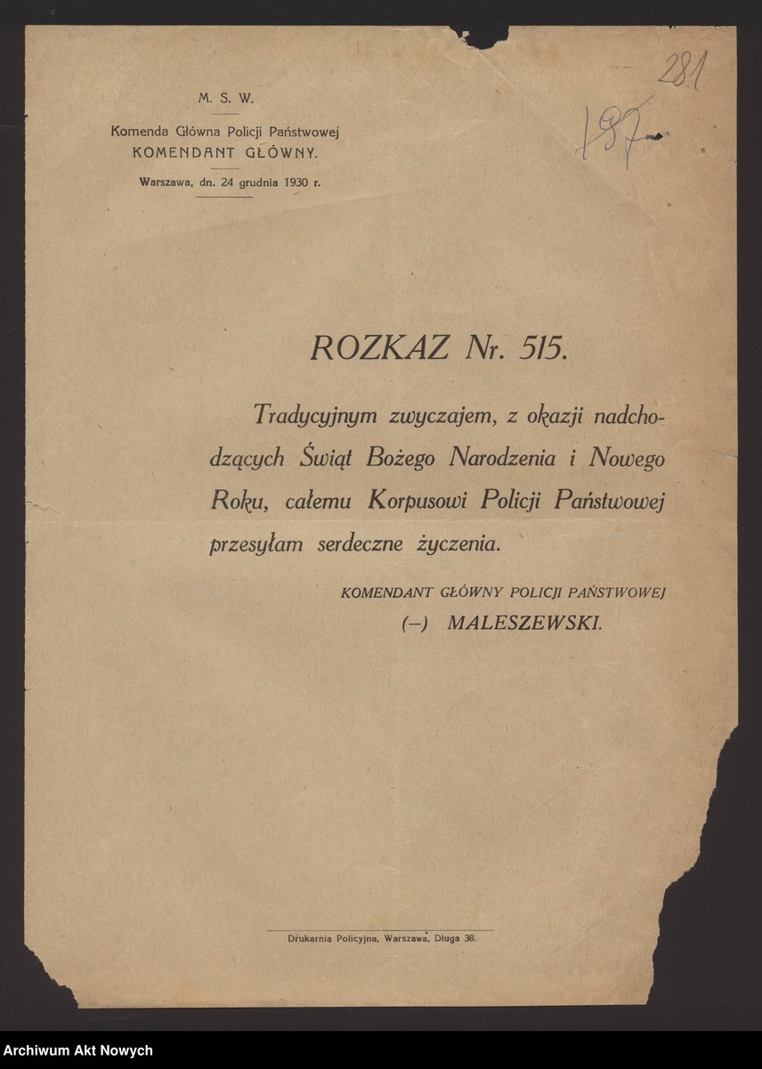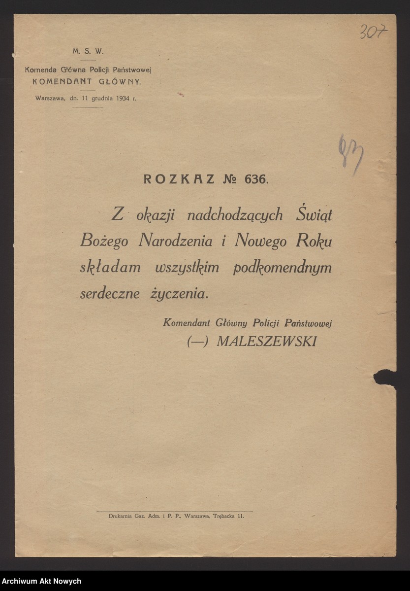 Rozkazy Komendanta Głównego Policji Państwowej, Archiwum Akt Nowych