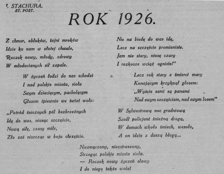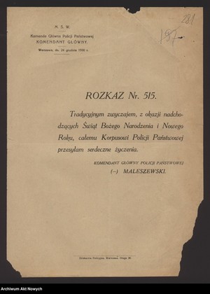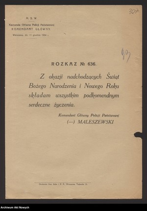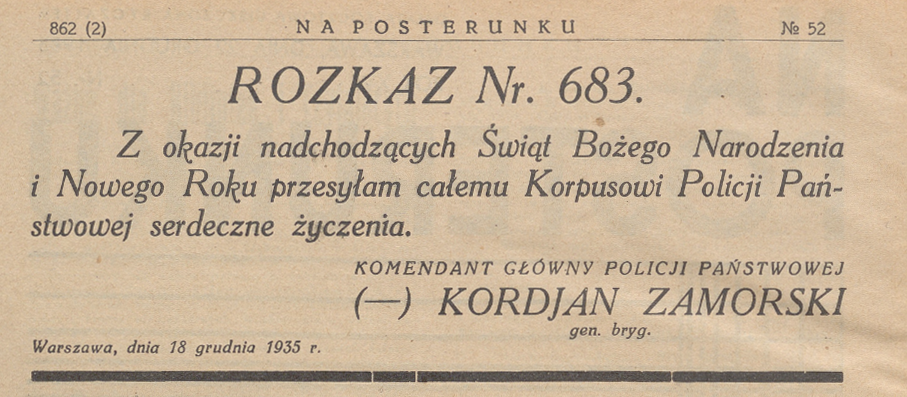 „Z okazji Świąt Bożego Narodzenia i Nowego Roku przesyłam całemu Korpusowi Policji Państwowej Serdeczne Życzenia”. Tymi słowami Komendant Główny Policji Państwowej gen. bryg. Józef Kordian Zamorski zwrócił się do swoich podkomendnych w rozkazie nr 663 z dnia 18 grudnia, oraz na łamach gazety policyjnej „Na posterunku”, w nr 52. 1935 r.