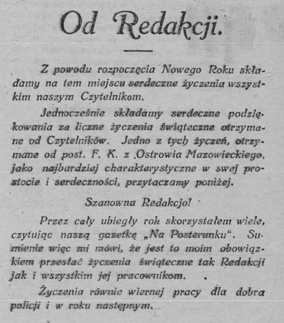 W tym szczególnym czasie na stronicach noworocznych numerów „Na posterunku”, znajdowały się przedruki życzeń składanych przez Komendantów Głównych PP a także przykłady twórczości poetyckiej funkcjonariuszy, a na okładkach publikowano żartobliwe rysunki, fotografie, związane z okresem noworocznym. Nierzadko do życzeń, przyłączała się także redakcja czasopisma.